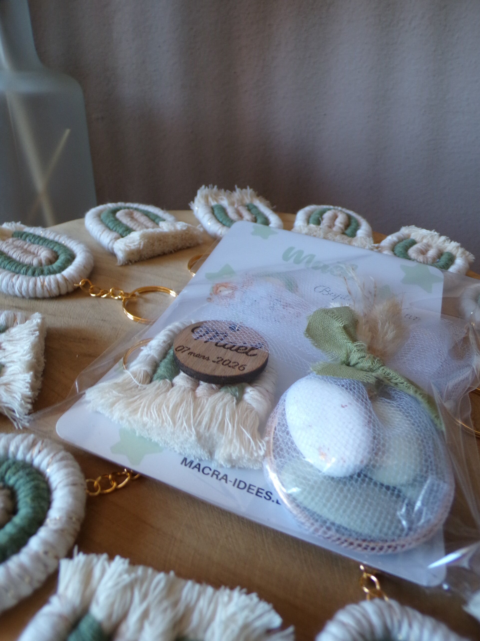 Nos cadeaux invités, comme les porte-clés cœur en macramé avec carte personnalisée et fleurs séchées, ou les porte-clés arc-en-ciel bohème, sont conçus pour laisser une impression durable et poétique. Chaque petite attention est pensée pour harmoniser votre événement dans un esprit doux et naturel.