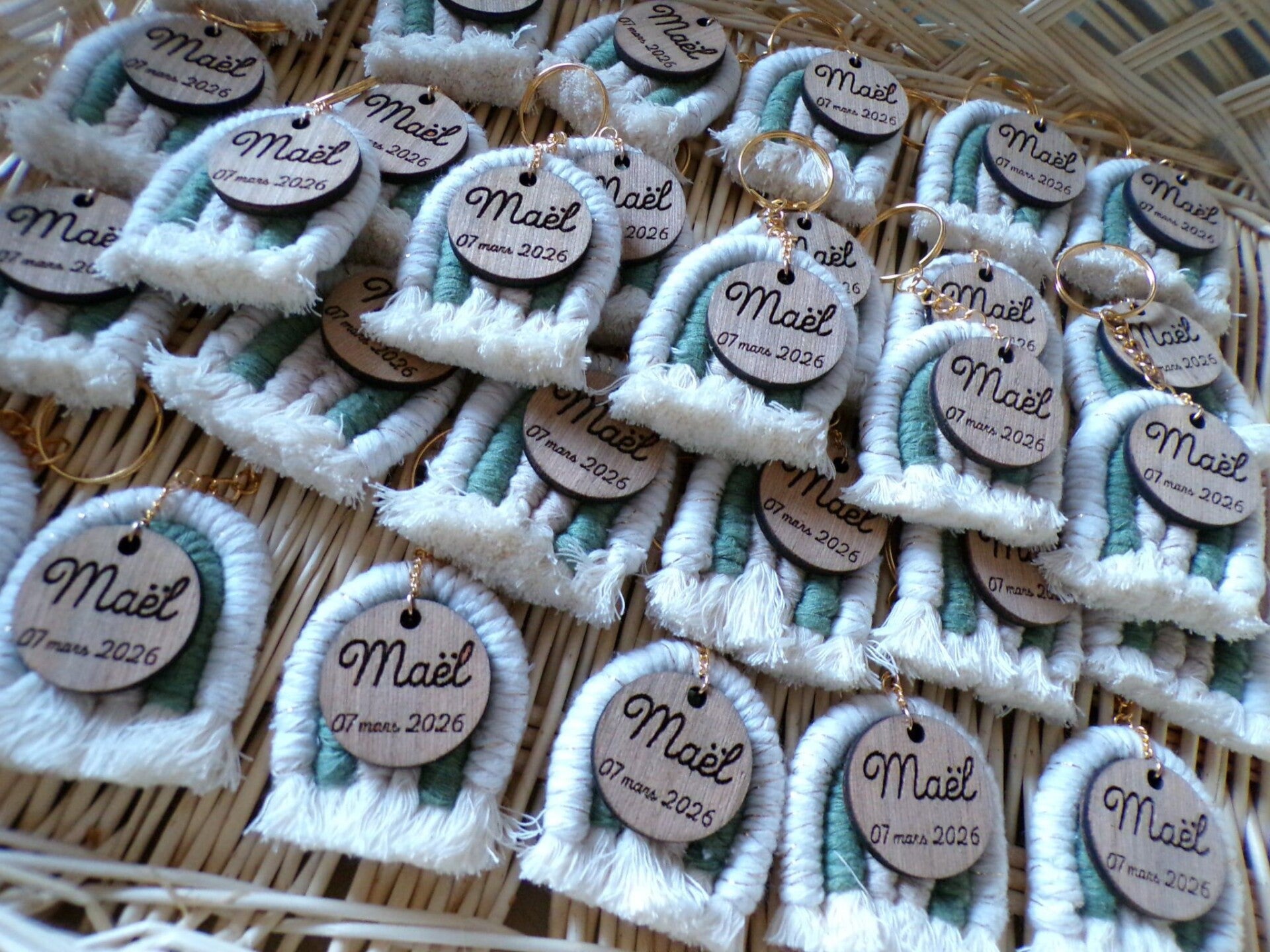 Offrez des porte-clés en macramé uniques, présentés sur de jolis cartons personnalisés avec la mention de votre mariage, baptême ou autre événement, agrémentés de dragées et de fleurs séchées. Une gamme complète de motifs est en construction pour s'adapter à tous les thèmes.