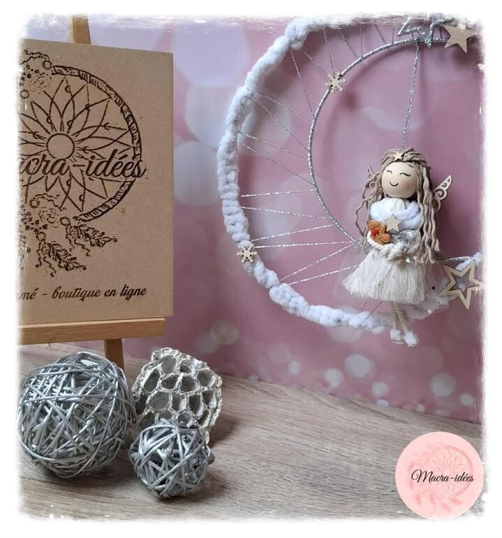 Ce joli ange de Noël viendra sublimer vos décorations de Noël et apportera un touche de douceur . Réaliser sur une lune en métal recouvert de laine chenille blanche et de lurex doré, l'ange est réalisé avec de la corde peignée et torsadée de qualité.