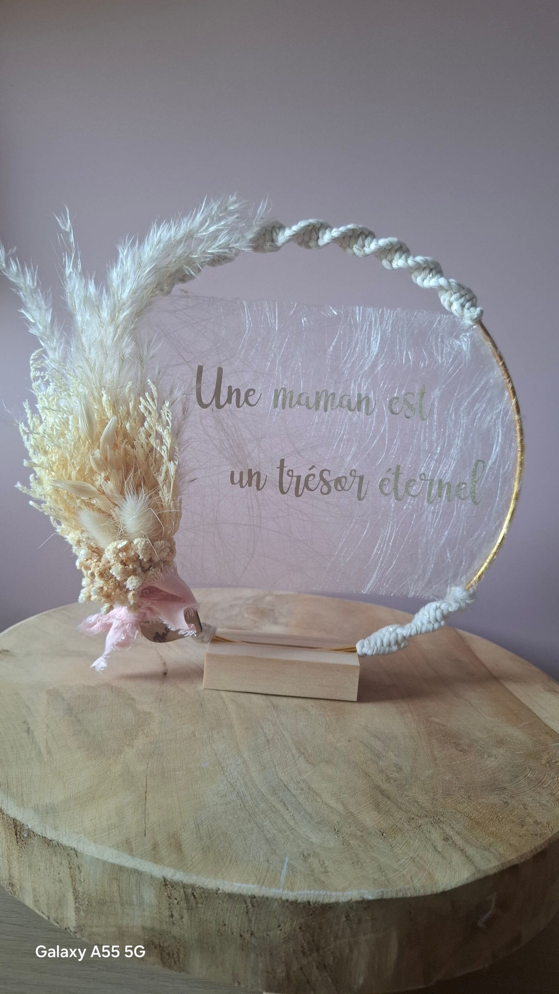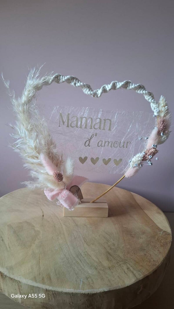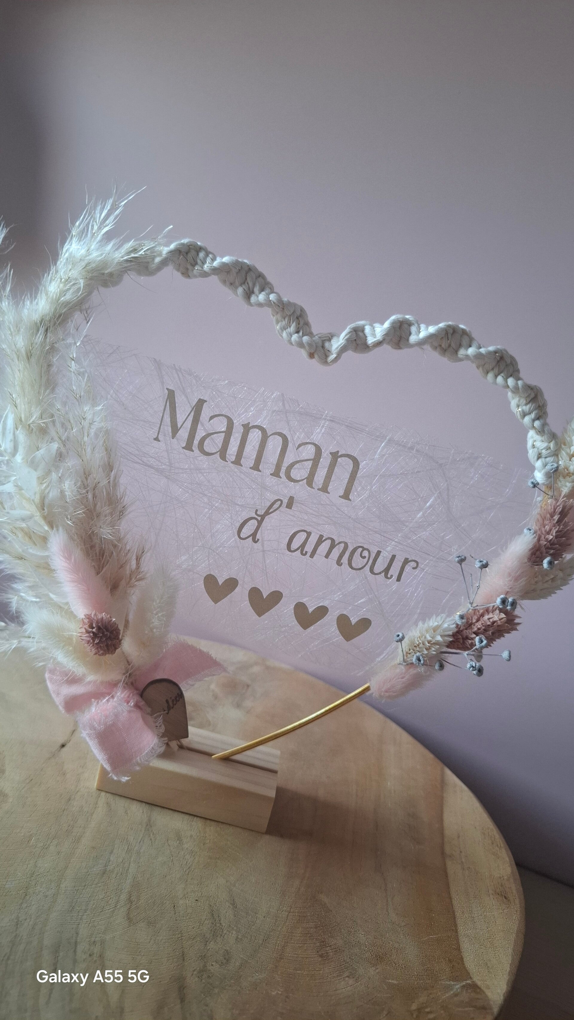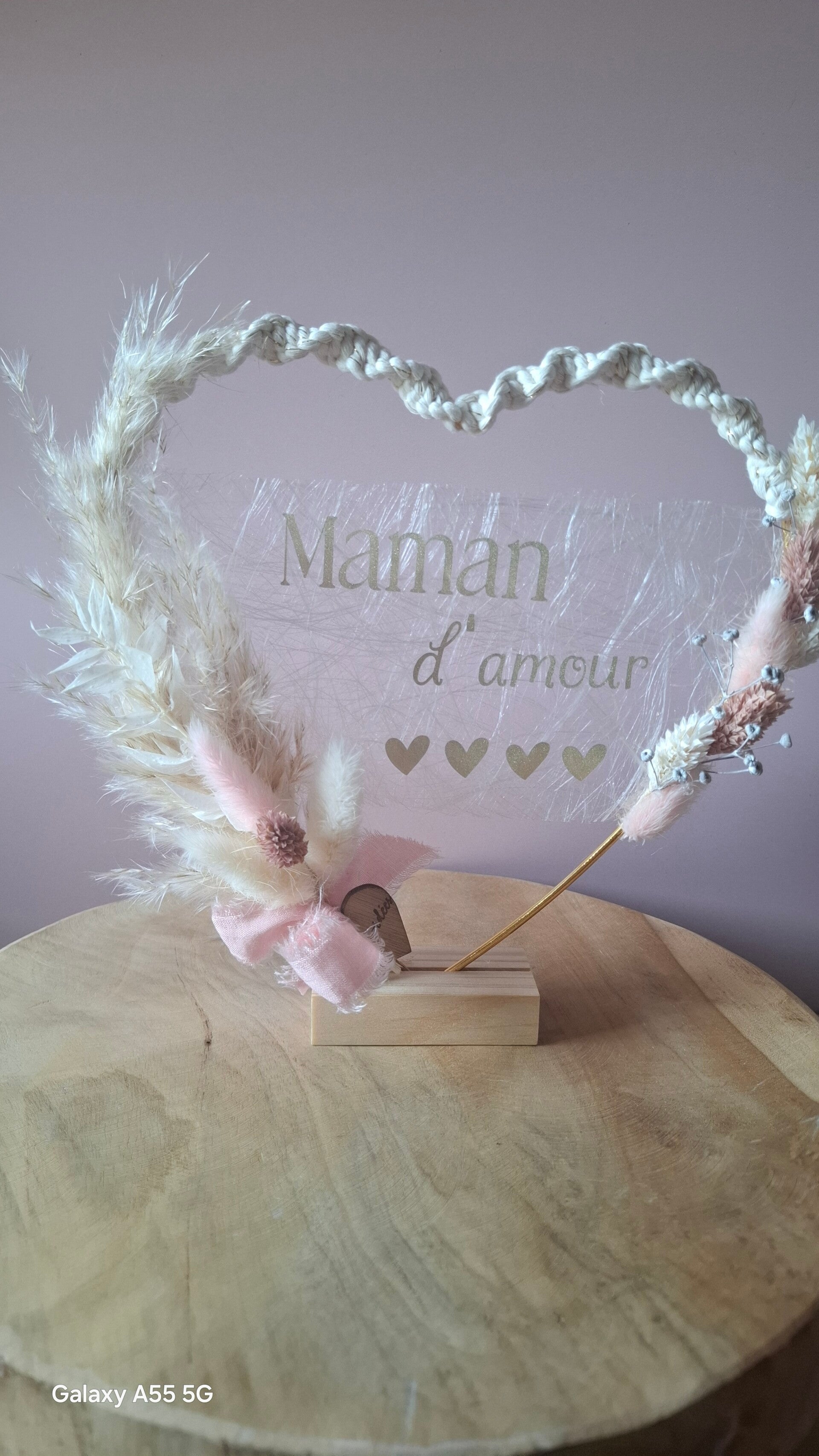 Cette jolie décoration bohème macramé est personnalisable. Créée ici pour la fête des mamans mais tout est possible et les phrases peuvent changer. rond et coeur de 20 cm. Réalisable dans les tons rose, vert , bleu et naturel.